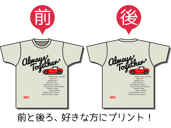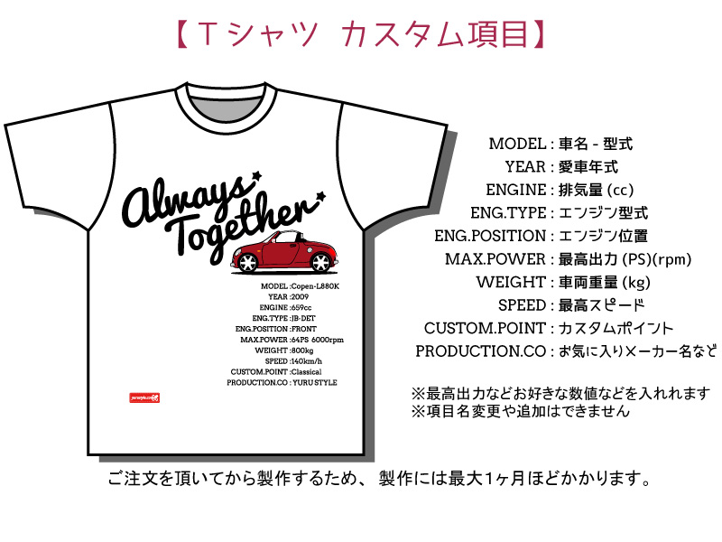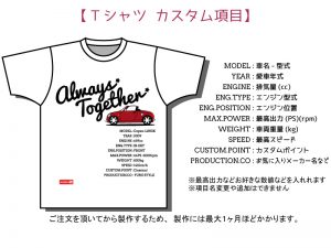 また車のスペックも一緒にプリントできる、カスタムできちゃうTシャツです。
